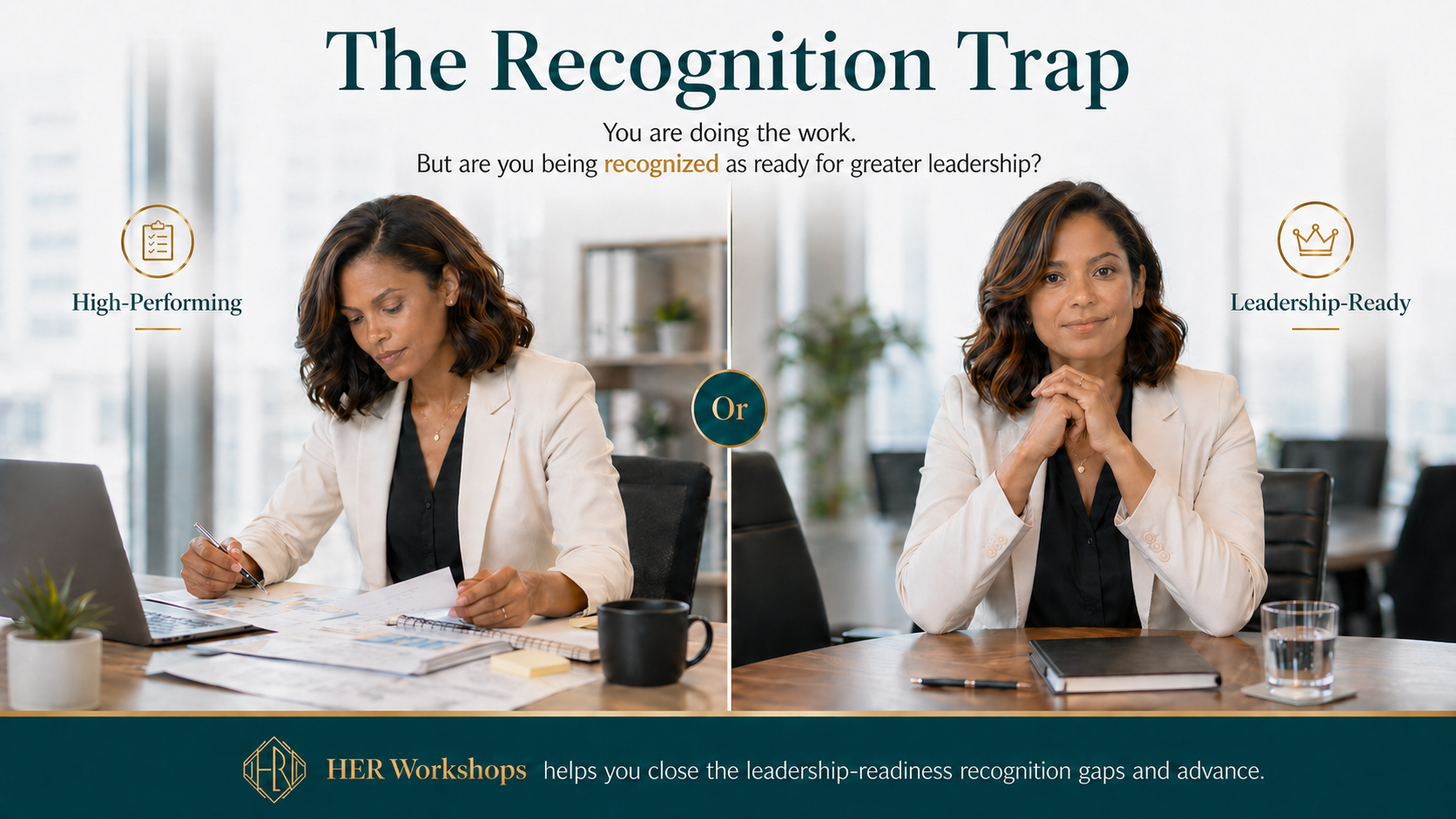 At HER Workshops, we help ambitious women professionals get unstuck, become executive-ready before the title, and advance into every next leadership seat.